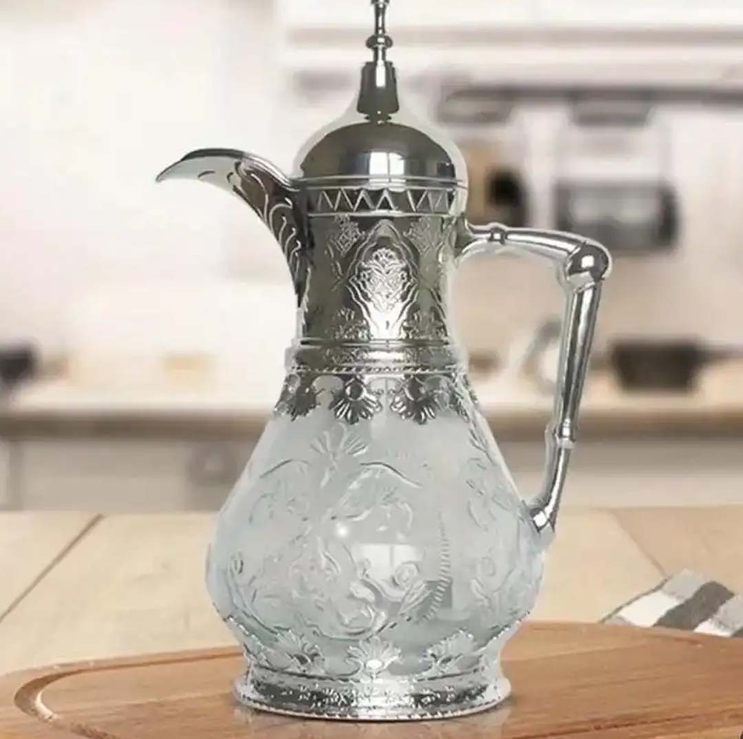 1 Pc Luxury Floral Crystal Glass Carafe – Stainless Steel Details, Food Grade, Intricate Design, Perfect for Tea, Milk, Coffee and Juice, Ideal Gift for Tea Enthusiasts and Coffee Lovers, gold ou silver.