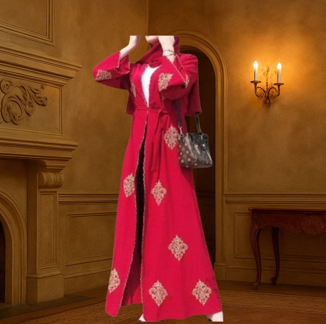 Vibrant luxury cardigan in red and navy blue, gold embroidered detail, open at the front – long sleeves with a special cut for refined women.